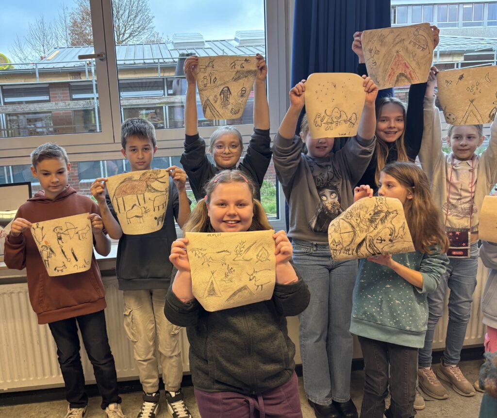 In den letzten Wochen hat sich die Klasse 5c im Geschichtsunterricht intensiv mit der Steinzeit beschäftigt. Besonders spannend war dabei das Thema Höhlenmalerei: Wie lebten die Menschen damals? Warum malten sie Tiere und Jagdszenen an die Felswände? Und wie fühlte es sich an, selbst wie steinzeitliche Künstlerinnen und Künstler zu arbeiten? Mit natürlichen Farbtönen, Kohlestiften…